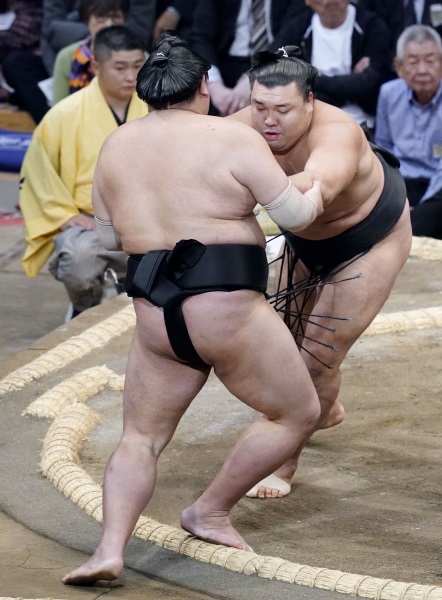 霧島(奥)が押し出しで阿炎を下す=福岡国際センター(C)共同通信社