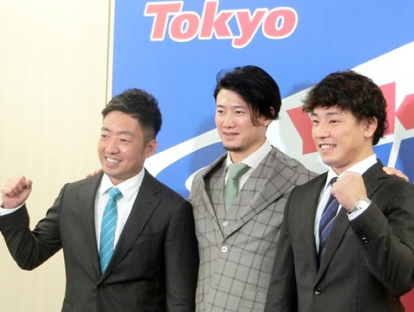 ヤクルトに入団した西川遥輝(中央)と嘉弥真新也(左)と増田珠(C)日刊ゲンダイ