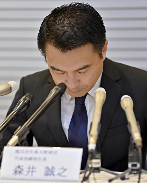 30日の記者会見で頭を下げる森井誠之球団社長(C)共同通信社