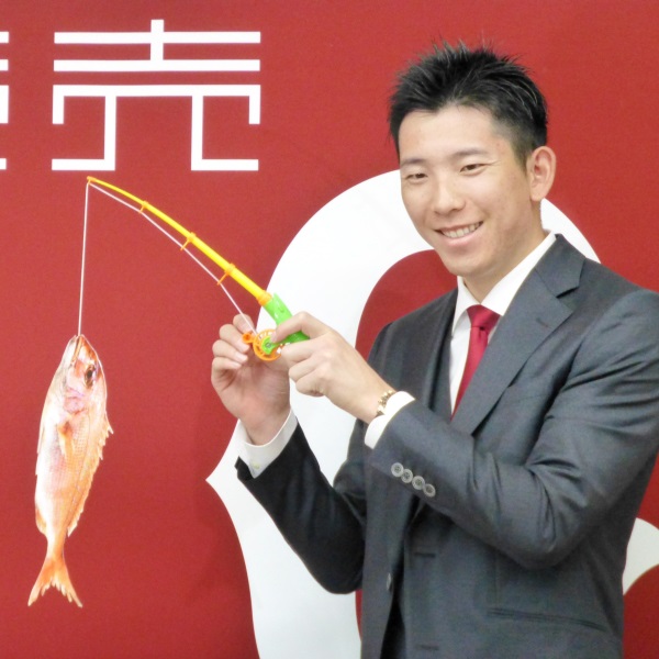 タイトル獲得にちなみタイを釣るポーズをとる巨人の戸郷=1日、東京都内の球団事務所(C)共同通信社