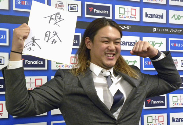 契約を更改し、笑顔でポーズをとる高橋光成(C)共同通信社