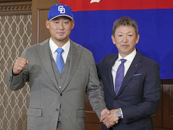 球団カラーの青いネクタイを締め入団会見に臨む中田(左)と立浪監督(C)共同通信社
