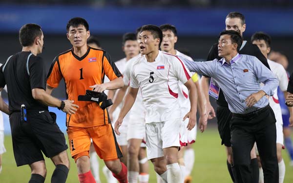 10月のアジア大会で日本に敗れた北朝鮮選手が審判団を恫喝(C)共同通信社