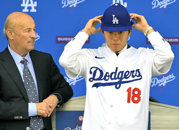 入団会見でドジャースの帽子をかぶる山本由伸(左は球団社長のスタン・カステン氏) (C)ロイター/USA TODAY Sports