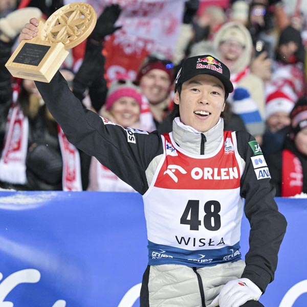 W杯ジャンプ男子個人第13戦で優勝し、トロフィーを掲げる小林陵侑(C)共同通信社