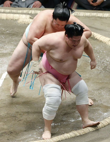 琴ノ若(奥)が送り出しで宇良を破る(C)共同通信社