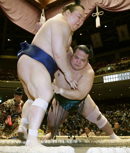 初場所3日目に寄り切りで宝富士を破る島津海(右)/(C)共同通信社