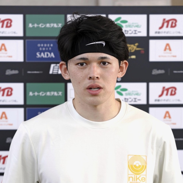 取材に応じるロッテ佐々木朗希 石垣キャンプ(C)共同通信社