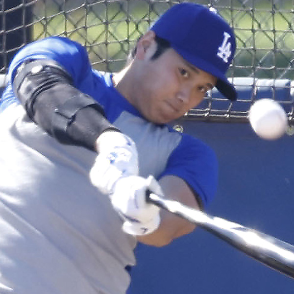 右肘の手術後初めてとなる、屋外でのフリー打撃を行うドジャースの大谷(C)共同通信社
