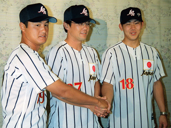 ヤクルトの古田を中心に握手をするプロとアマの両エース、西武の松坂(右)と日本生命の杉浦(C)共同通信社