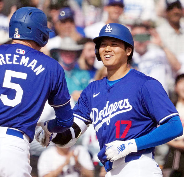 五回の第3打席で2ランを放ってフリーマン(左)に迎えられる大谷(C)ロイター/USA TODAY Sports