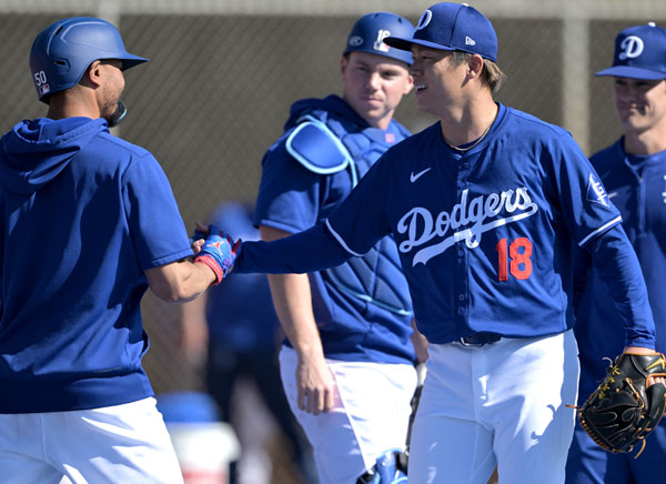 ベッツと握手をしながらチームメートらと歓談する山本(C)ロイター/USA TODAY Sports