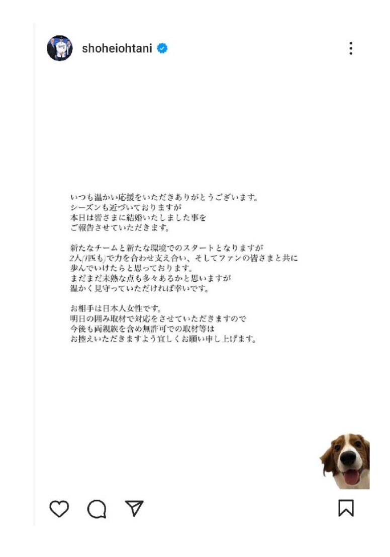 大谷の結婚発表全文(C)本人のインスタグラムから!