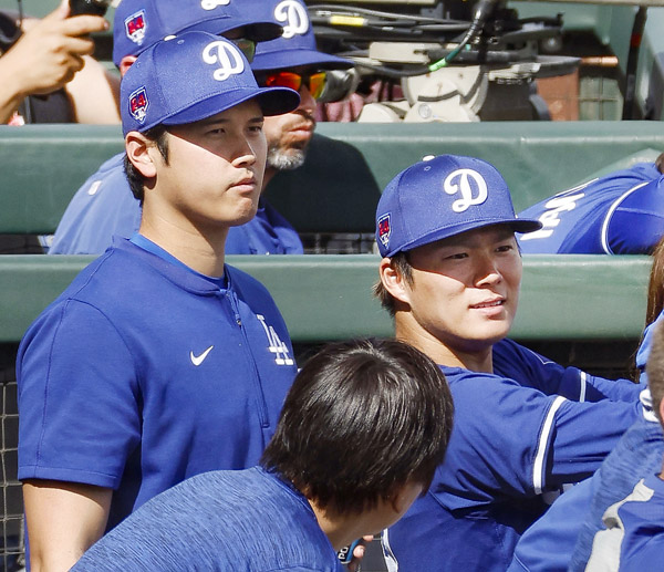 大谷(左)はレンジャーズ戦に駆け付け、山本のデビュー戦を見守った(登板を終え、ベンチで大谷と一緒に試合をみる山本)/(C)共同通信社