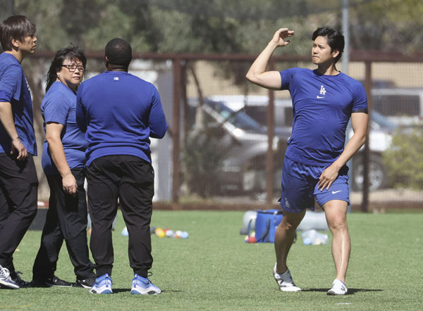 大谷の投球をチェックする理学療法士のジョディ・セト氏(左2)/(C)共同通信社