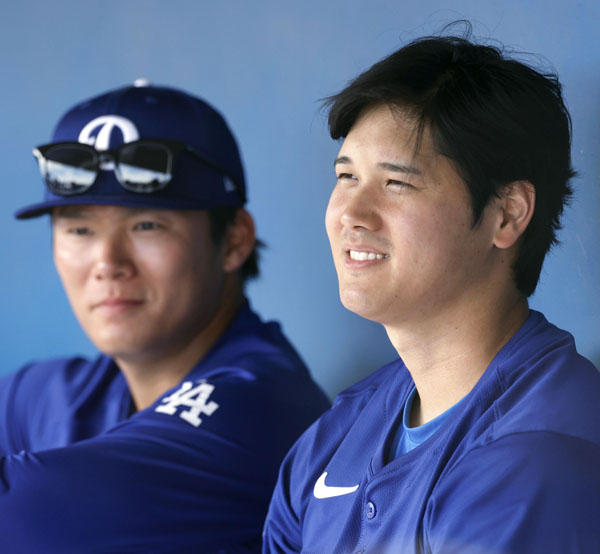 Wタイトル取りに期待は大きいが…(オープン戦をベンチで見守る大谷と山本=左)/(C)共同通信社