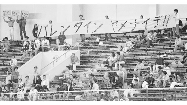 1995年に「バレンタイン ヤメナイデ!!」の横断幕を揚げるロッテファン(C)共同通信社