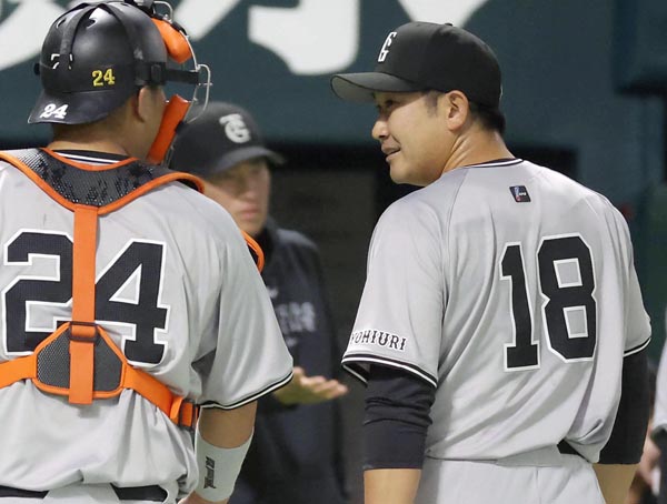 二回を終えて捕手の大城卓三捕手(左)と話しながらベンチへ戻る菅野(C)共同通信社