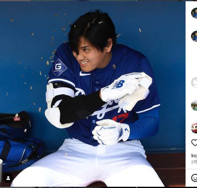 ヒマワリの種を投げつけられている大谷(C)ドジャースの公式カメラマンを務めるジョン・スーフー氏のインスタグラム(@jon.soohoo)より