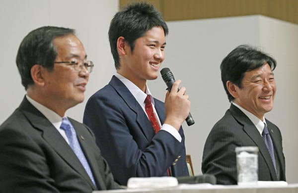 日本ハムの入団会見で笑顔を見せる大谷=中央(右は栗山監督、左は津田敏一球団社長)/(C)共同通信社
