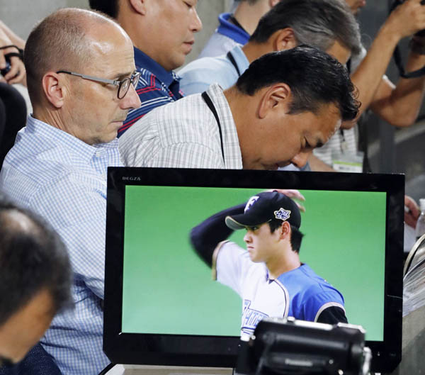 獲得に自信たっぷりのヤンキースのキャッシュマンGM(左端)だったが…(2017年日本ハム―ソフトバンク戦、大谷を視察)/(C)共同通信社