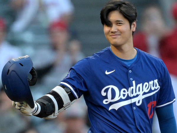 日本時間27日、約半年ぶりに古巣エンゼルススタジアムに登場し、ファンの歓声に応える大谷(C)ロイター/USA Today Sports