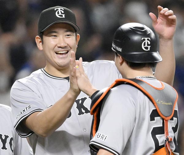 中日に勝利して小林(右)と喜ぶ菅野(C)共同通信社