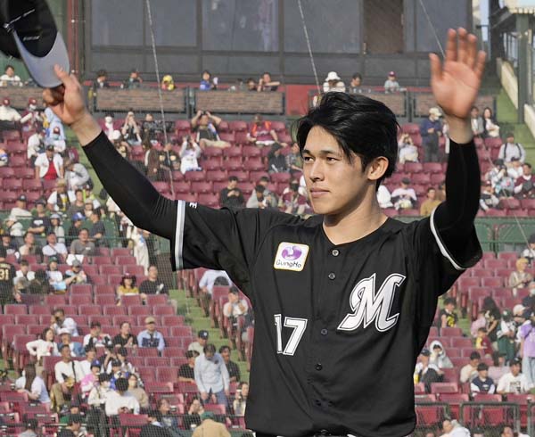 2勝目を挙げて声援に応える佐々木朗希(C)共同通信社