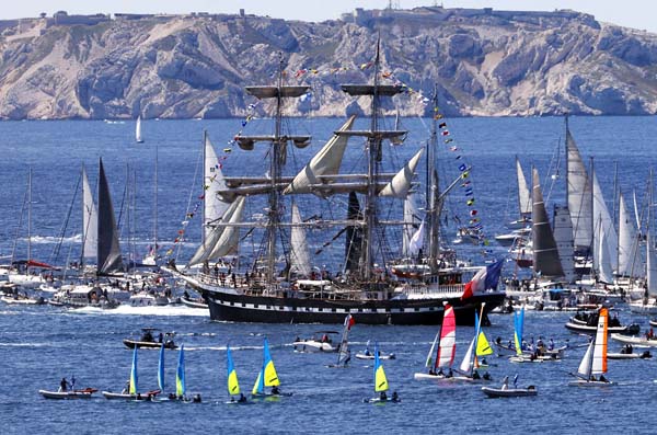 仏マルセイユに到着した聖火を載せたベレム号(C)共同通信社