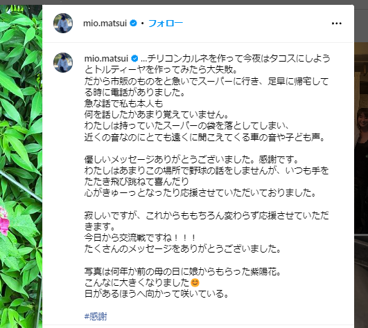 松井監督から休養を告げられた際の心境を赤裸々に綴った美緒夫人のSNSを確認する(C)本人のインスタグラムから