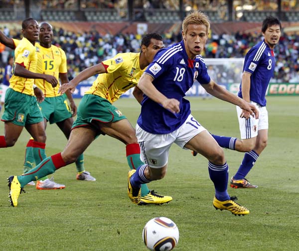 本田の先制弾は松井(右)の左足から生まれた(C)日刊ゲンダイ