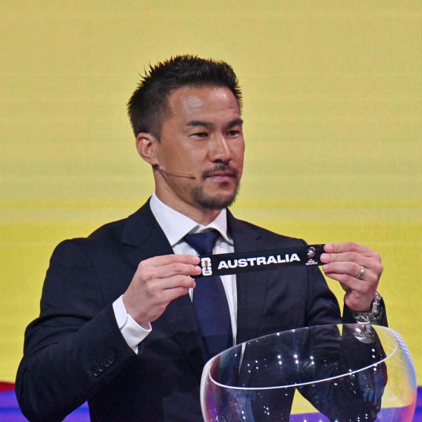 抽選会で元日本代表FW岡崎慎司がドロワーを務めた(C)Xinhua/ABACA/共同通信社