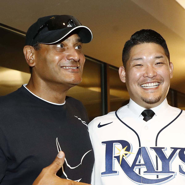 レイズ時代の筒香(右)とデストラーデ氏(C)共同通信社