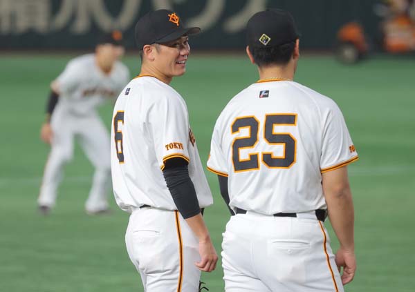 守備位置で岡本と話し笑顔を見せる(C)日刊ゲンダイ