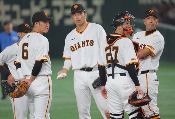 マウンドに集まる阿部監督と野手陣(C)日刊ゲンダイ