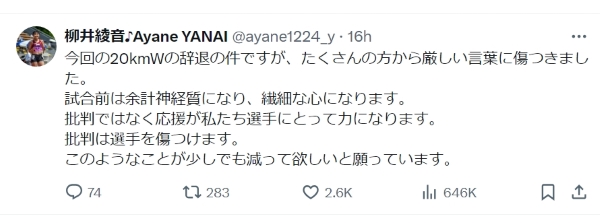 柳井綾音選手の悲痛の訴え(本人のⅩより)む