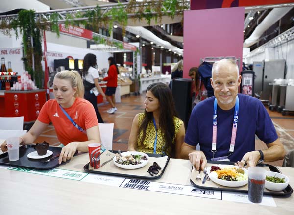 選手村で食事をするハンガリー国防・スポーツ大臣(右)とフェンシング銅メダリストのエステル・ムハリ(左)/(C)ロイター(C)日刊ゲンダイ