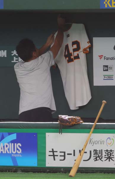 試合前にヘルナンデスのユニフォームが掲げられる(C)日刊ゲンダイ