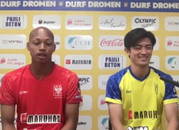 シント=トロイデンの新加入ズーム会見でのGKブライアンとDF谷口(提供写真)