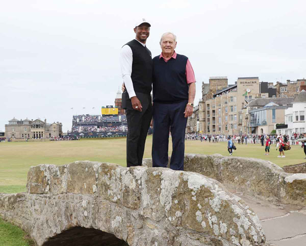 聖地の“スウィルカン・ブリッジ”で記念撮影をするニクラス(右)とウッズ=2022年全英オープン(C)ロイター/Action Images