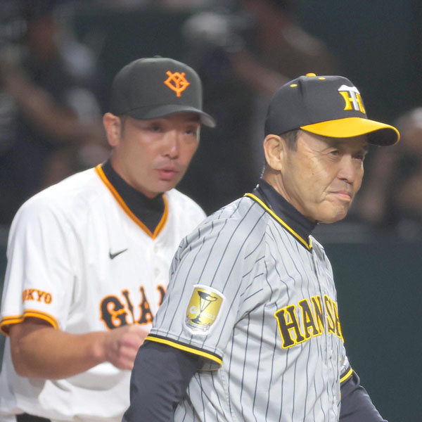阪神・岡田監督と巨人・阿部監督(左奥)/(C)日刊ゲンダイ