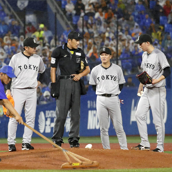 二回に投球の途中でマウンドの整備を求める戸郷(右端)/(C)共同通信社