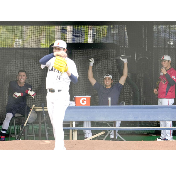 佐々木朗希(手前)の後ろで笑顔を見せる(左から)ヌートバー、大谷、山本(C)共同通信社