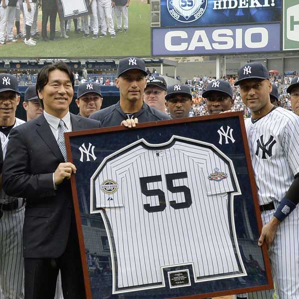 引退セレモニーで、額に入ったユニホームを手にジーター(右端)らヤンキースナインと記念撮影する松井秀喜氏=2013年7月29日、ヤンキースタジアム(C)共同通信社