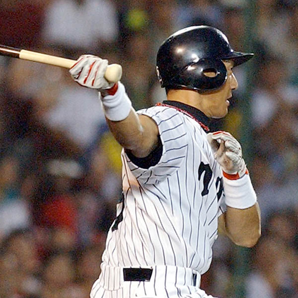 2004年7月30日の巨人戦、骨折した左手首をかばいながら安打を放つ金本知憲(C)共同通信社