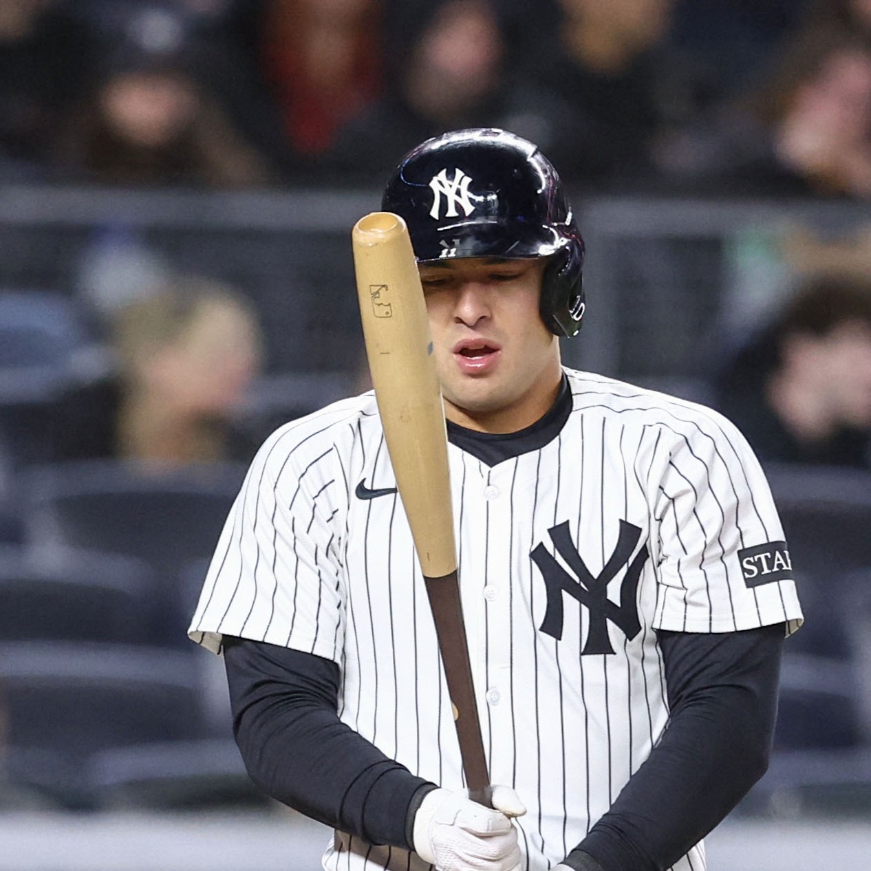 「魚雷バット」を見つめるヤンキースのアンソニー・ボルペ(C)ロイター/Imagn Images