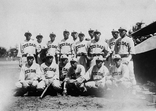 東京六大学野球秋のリーグ戦 記念写真に納まる帝大チームの選手たち=1929(昭和4)年9月14日、神宮球場(日本電報通信社撮影)