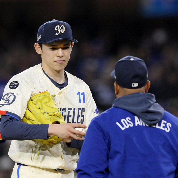 ロバーツ監督と佐々木朗希(C)共同通信社