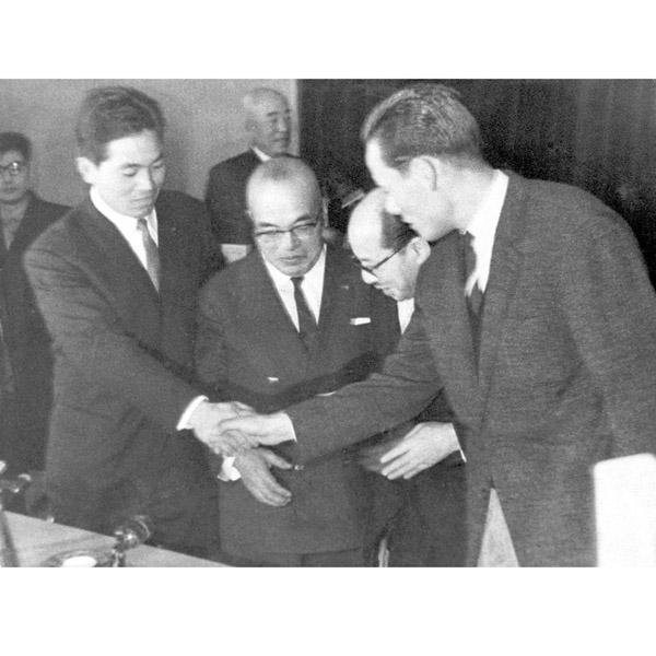 トレード発表後握手を交わす(左から)山内一弘外野手、阪神の野田誠三オーナー、大毎の永田雅一オーナー、小山正明投手=1963(昭和38)年12月26日、大阪市梅田の阪神電鉄本社(C)共同通信社