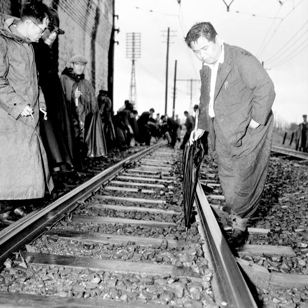 下山国鉄総裁が発見された現場を検視する堀崎繁喜捜査一課長(C)共同通信社